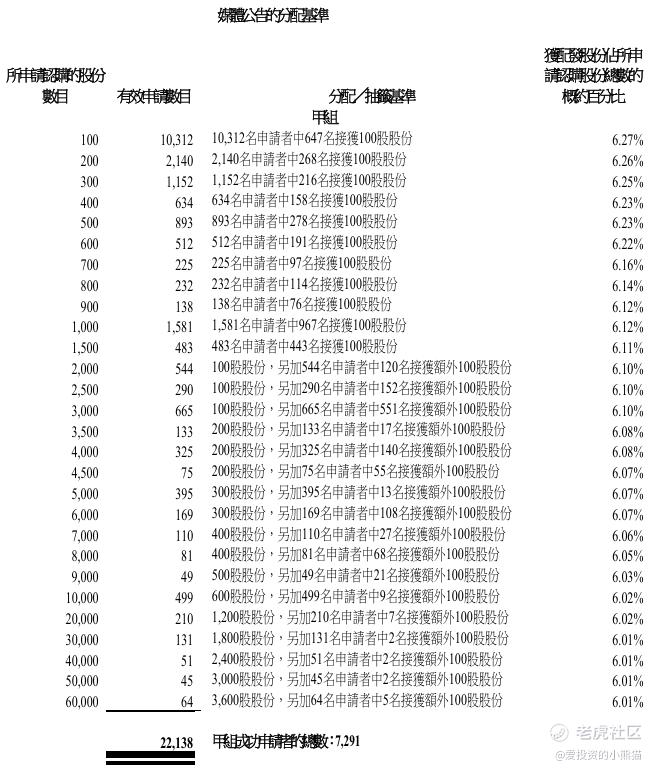 维升药业-B(02561.HK)的乙组官方披露的中签名单里有41人中签4600股,有35人中签4700股,有9人中签5300股,有1人中签5400股,有2人中签5900股,有6人中签6000股,有24人中签6600股,有13人中签6700股,有9人中签9900股,有11人中签10000股,有3人中签13200股,有9人中签13300股,有4人中签16600股,有8人中签19900股,有1人中签20000股,有2人中签23200股,有1人中签23300股,有1人中签26500股,有1人中签26600股,有1人中签29900股,有17人顶头槌认购中签32800股,有8人顶头槌认购中签32900股。乙组总共中签227.70万股,货值约1.57亿港元。