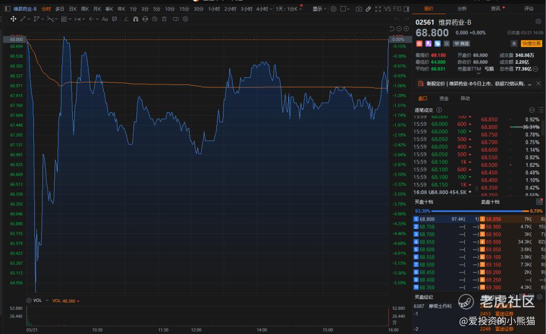 $维升药业-B(02561)$今日上市平开,秒升到69.15港元后,立马回落到64.80港元止跌,再震荡上行,截止中午收盘价为68.80港元,开盘不涨不跌,收盘也是不涨不跌,开盘是绿鞋护盘,收盘也是绿鞋护盘,这票得亏有大摩护盘在。