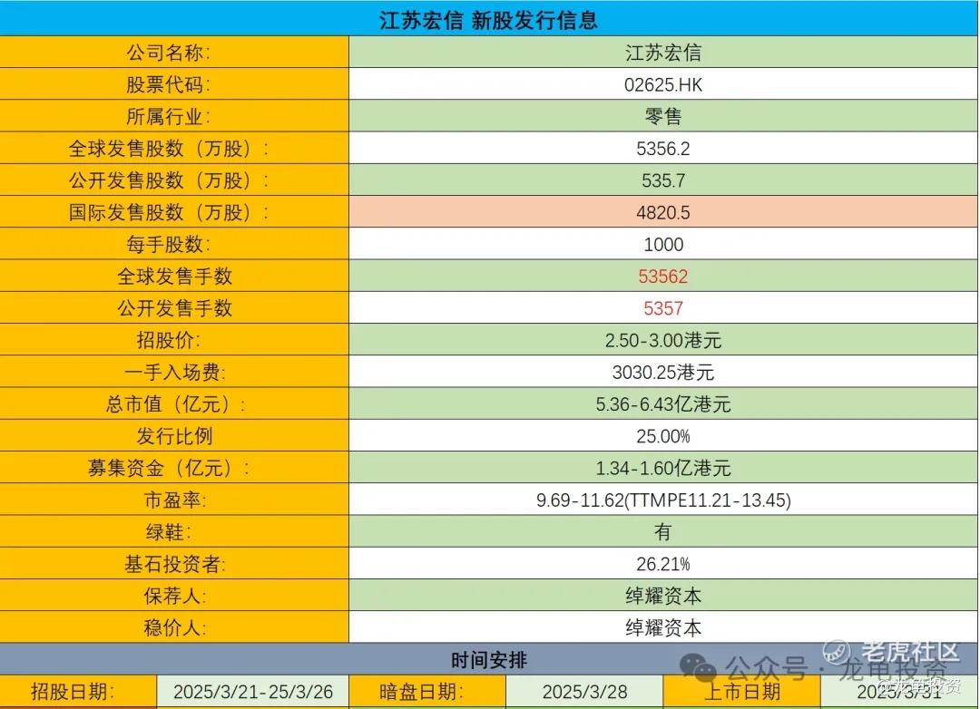 宏信超市在2025年3月21日发布了全球发售招股章程,计划在香港联合交易所主板上市,发售53,562,000股H股,发行价预计不超过每股3.00港元,且不低于每股2.50港元。公司计划将所得款项用于开设新零售店铺、建立新配送中心、建立新的中央厨房以及增强ERP系统和基础设施系统。