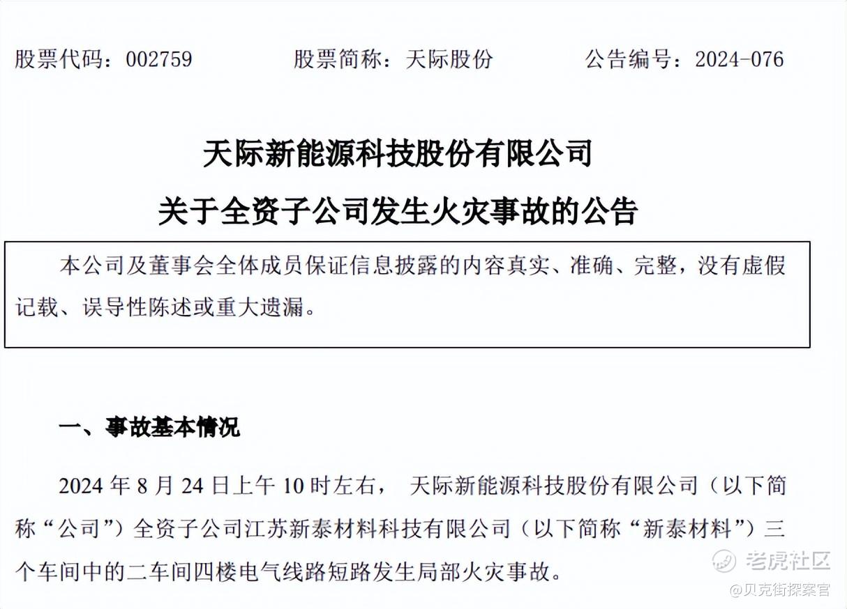 据天际股份2024年8月26日公告,公司2024年8月24日上午10时左右,旗下全资子公司江苏新泰材料科技有限公司(以下简称“新泰材料”)三个车间中的二车间四楼电气线路短路发生局部火灾事故。