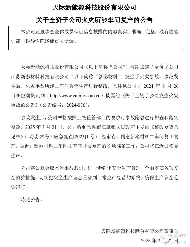 不过结合泰鸿万立所处行业来看,任何一个制造工厂消防安全都是重中之重,就在2025年3月21日晚间,上市公司天际股份披露了全资子公司火灾所涉车间复产的公告。