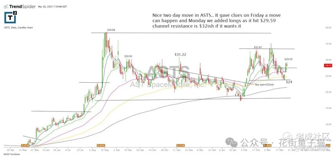 ASTS 连续两日走强。周五已有异动迹象,周一我们在 $29.59 加仓。若有上行动能,通道压力在 $32 附近。
