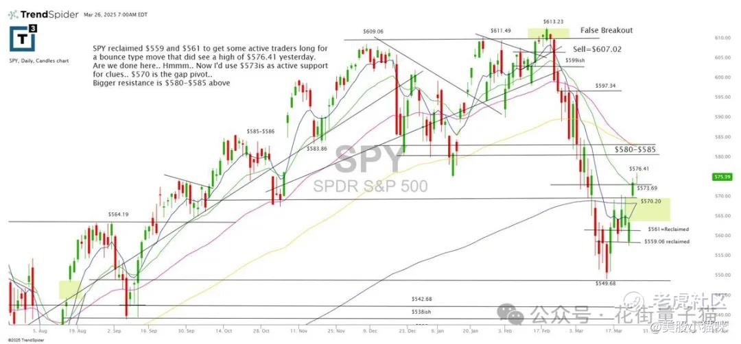 SPY重新站上559和561,吸引了一些激进交易者做多,并在昨日反弹至576.41的高点。我们是否见顶了?嗯……现在我会以573附近作为主动支撑观察点。570为缺口支撑位,更大的阻力在580–585区间。