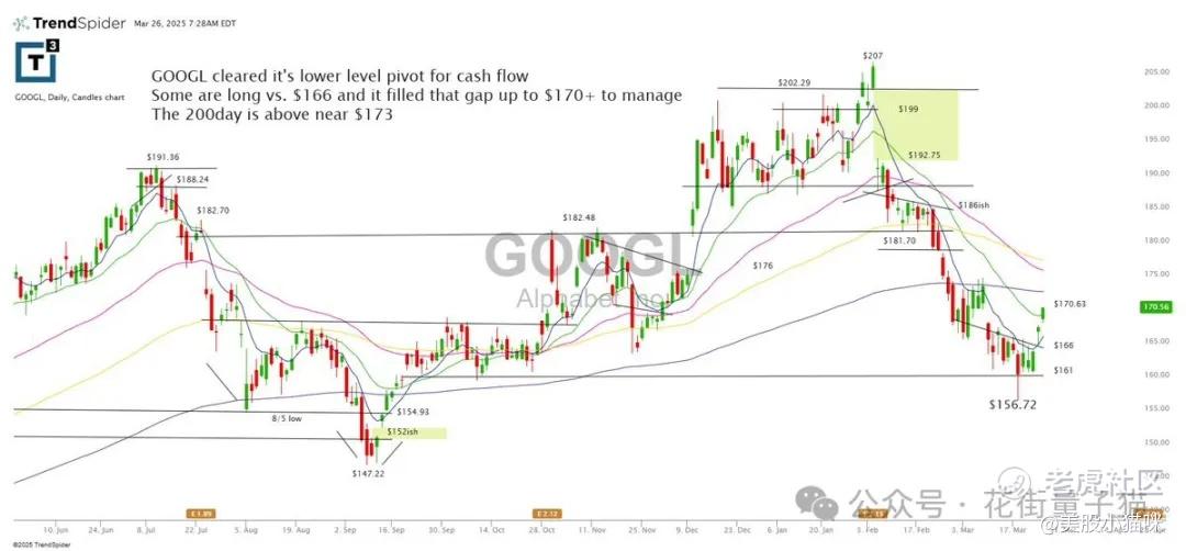 GOOGL 突破了下方的关键支撑位以释放现金流。有些人以 $166 为支撑建立了多头仓位,它确实填补了上方 $170+ 的缺口。200日均线在 $173 附近。