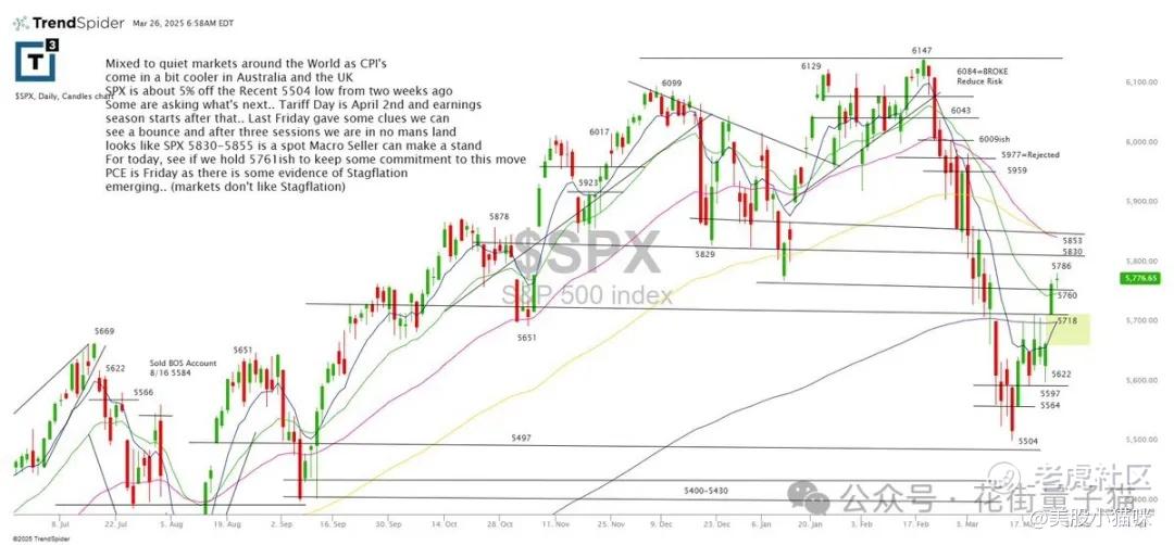 全球市场反应平静,因澳大利亚和英国的CPI略显降温。SPX较两周前的5504低点上涨约5%。有人在问接下来会怎样……关税日是4月2日,随后财报季开启。上周五给了一些线索,看看是否能继续反弹。三天反弹后,当前属于“无人区”。SPX的5830–5855区域或是宏观卖方出手的点位。今天看看是否能守住5716附近,以保持对本轮上涨的承诺。本周五的PCE数据存在一些滞涨迹象(市场不喜欢滞涨)。