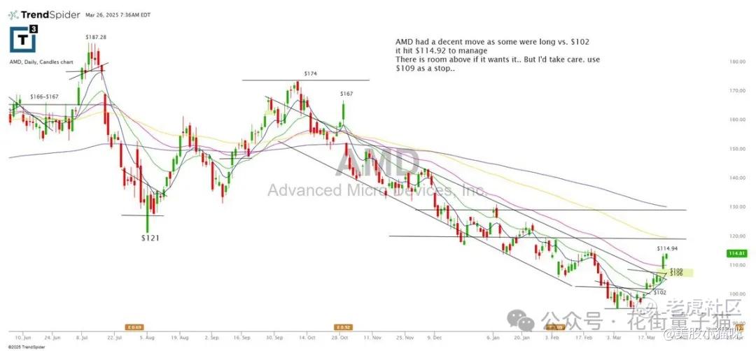 AMD 有一波不错的上涨,一些人在 $102 左右做多,昨天上涨至 $114.92。我会注意上方空间是否打开,但会谨慎操作,止损参考 $109。