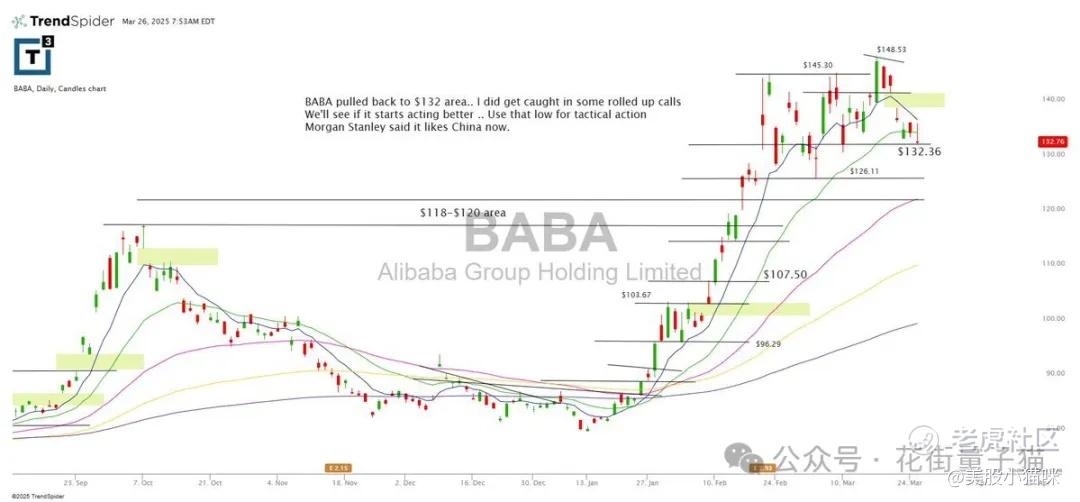 BABA 回调至 $132 附近……我在上方滚动加仓了一些看涨期权被套了。看看是否能重新走强……可以把前低作为策略参考点。摩根士丹利表示他们看好中国。