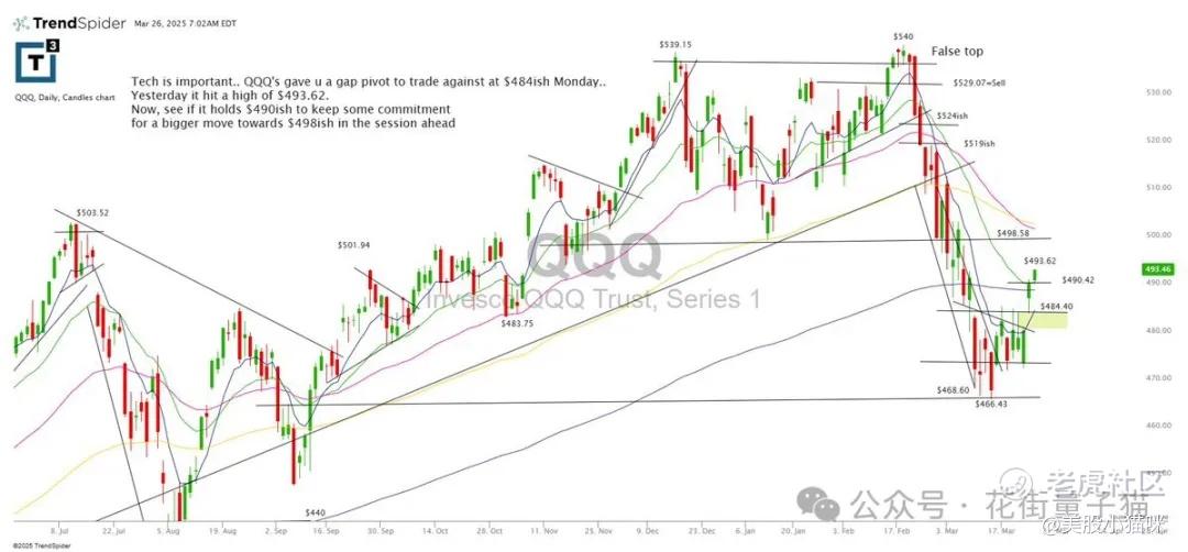 科技股很关键。QQQ在周一给了我们一个484美元附近的缺口支撑作为交易依据。昨天高点是493.62,现在看看是否能守住490附近,以继续走高至498左右。