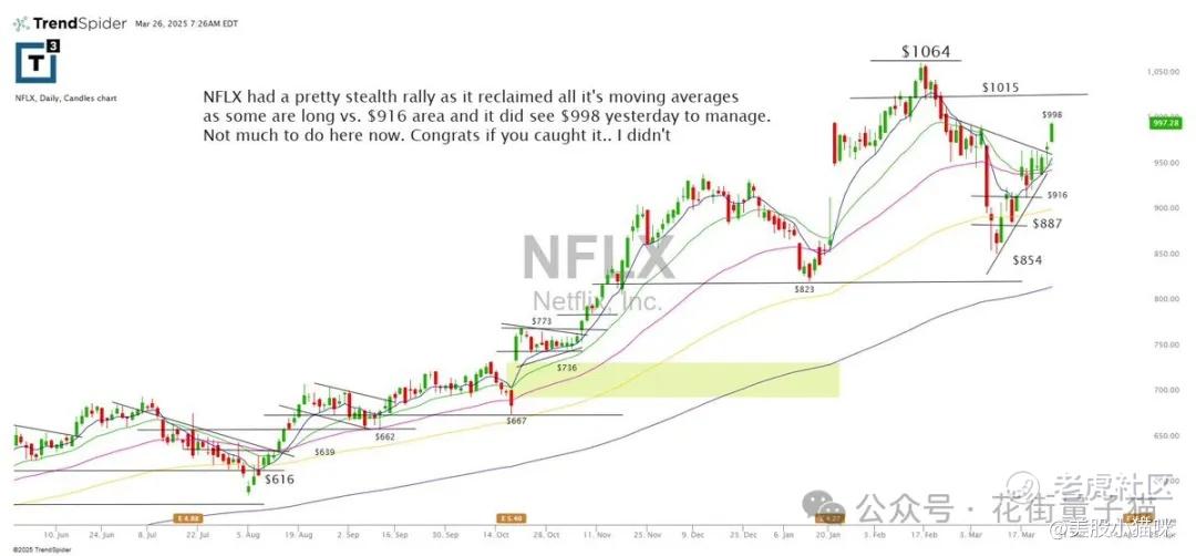 NFLX 有一个相当隐蔽的上涨,因为它重新站上了所有均线。有些人以 $916 区域为支撑建立了多头仓位,昨天最高达到 $998。现在没什么可做的了,恭喜那些抓住机会的人…我没抓到。