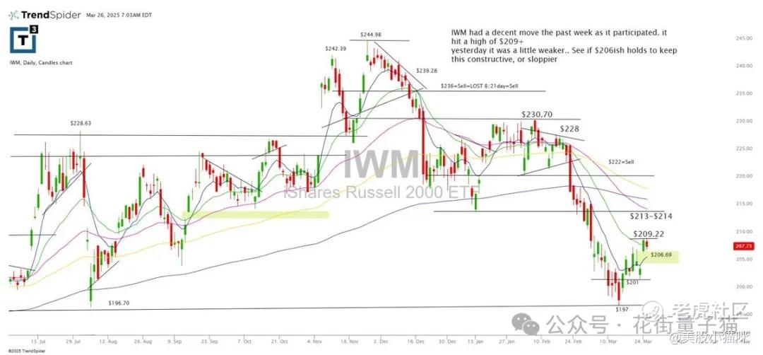 IWM上周表现尚可,参与了市场反弹,最高达到209+。但昨天表现稍弱……看看206附近是否能守住,维持目前的结构性反弹,或者会走弱。