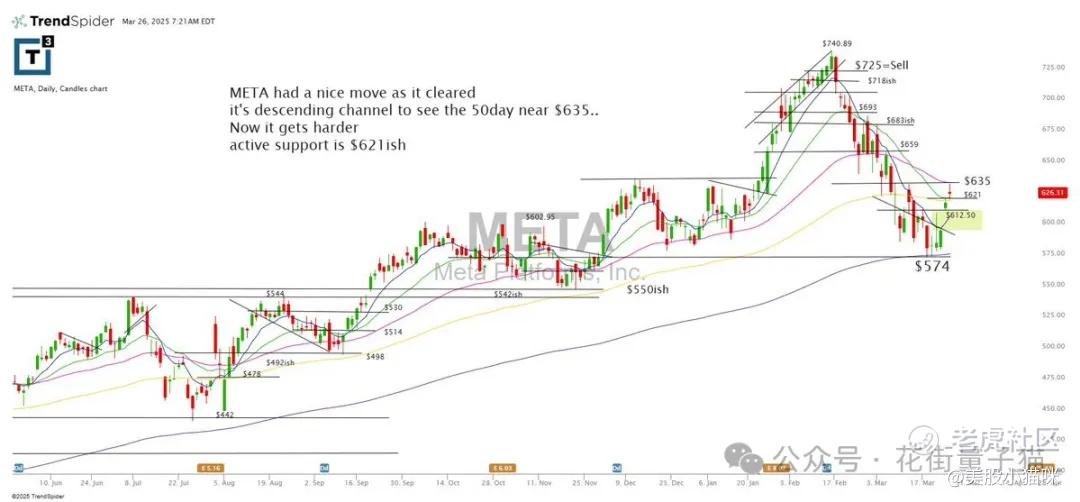 META 有一个不错的上涨动作,因为它突破了下降通道,看向50日线附近的 $635。现在开始变得困难,活跃支撑位在 $621 左右。