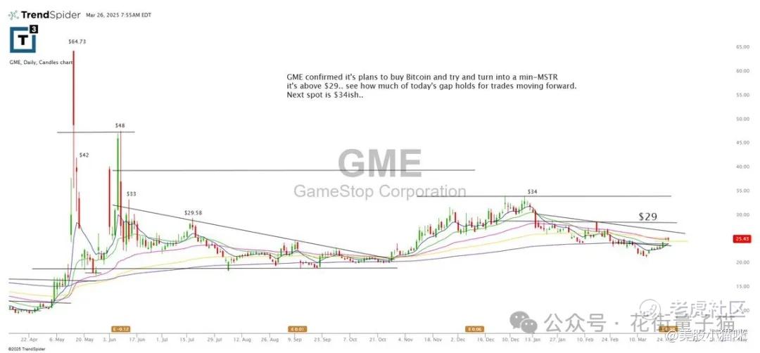 GME 确认计划收购比特币并尝试转型为 mini-MSTR,目前已站上 $29……看看今天的缺口能否守住,若守住,有望挑战下一个目标 $34 附近。