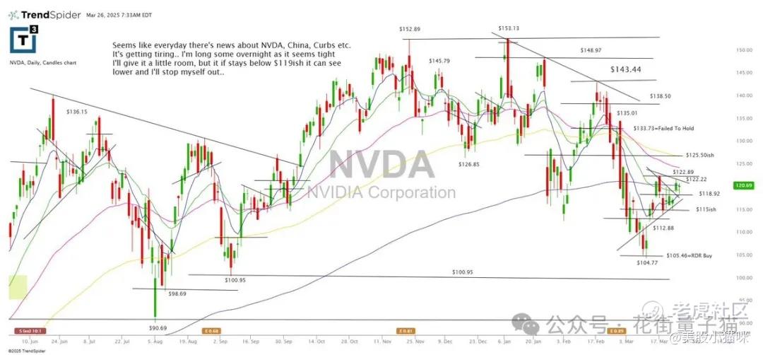 感觉每天都有关于英伟达、中国、限制等的新闻,有点让人疲惫……我隔夜持有一些仓位,因为走势显得紧凑。我会给它一点空间,但如果维持在 $119 附近以下,可能会走弱,我就会止损出局。