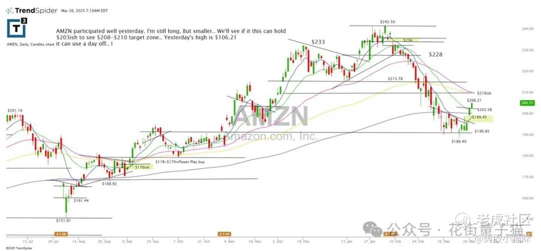 AMZN昨天表现不错。我仍然持有多单,但规模缩小了……我们将看看它能否守住203美元,目标区间在208–210之间。昨天高点为206.21。如果它今天休整一下也没问题