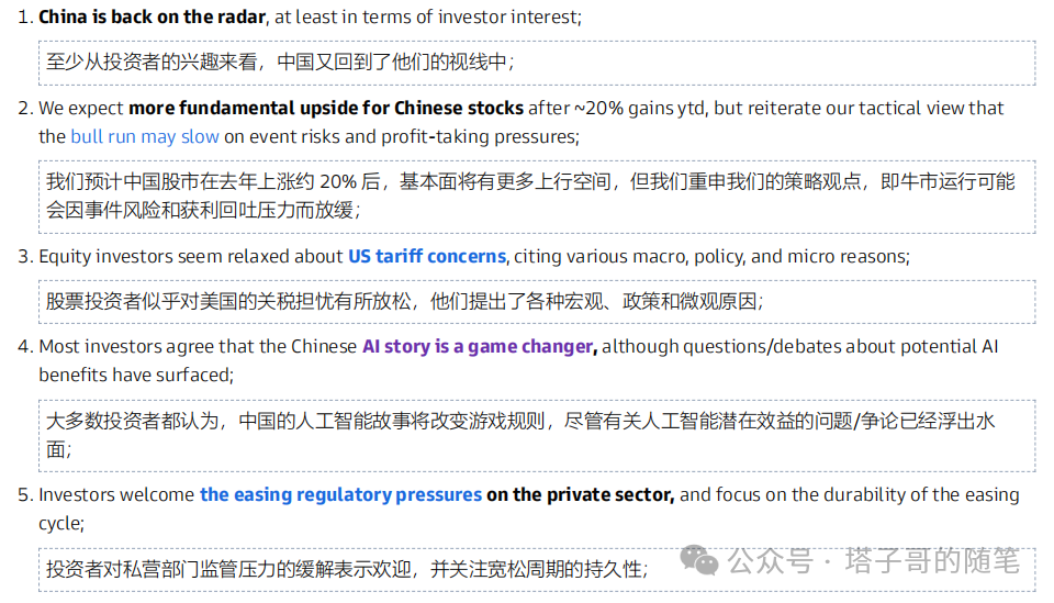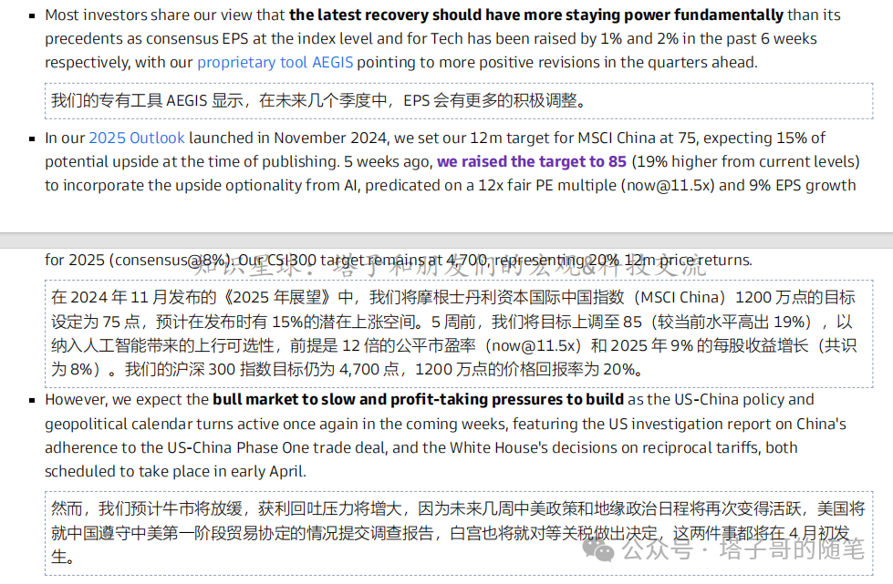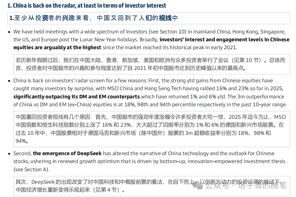 今日高盛发表路演纪要:中国又回来了,此外摩根士丹利的Lura Wang团队也宣布上调中国市场的评级和指数目标点位。