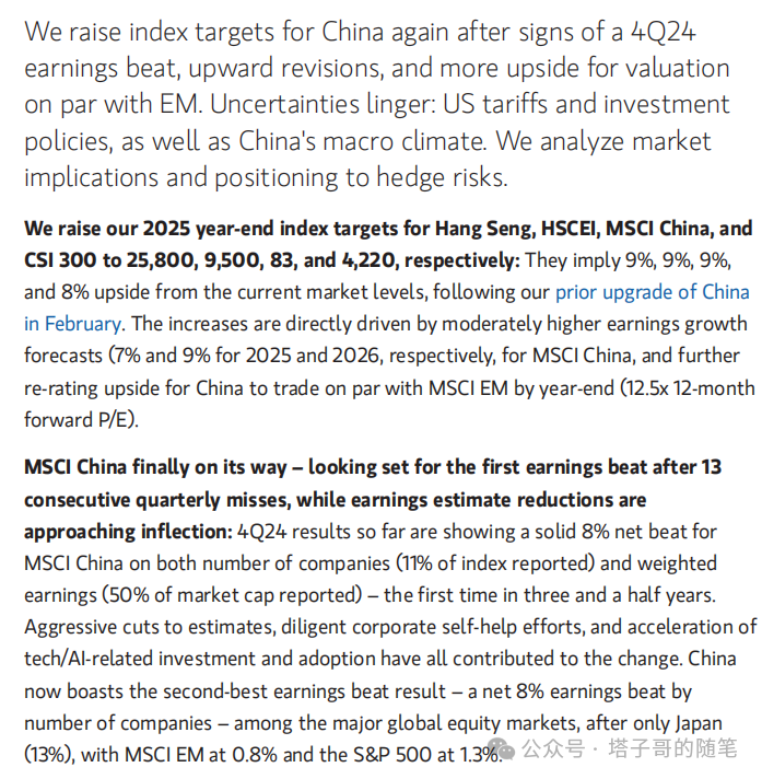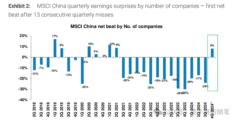 :2024年四季度数据显示,MSCI中国成分股中已披露业绩的公司(占指数权重的50%)实现8%的净盈利超预期(按公司数量计占11%),这是自2021年三季度以来首次出现积极反转。