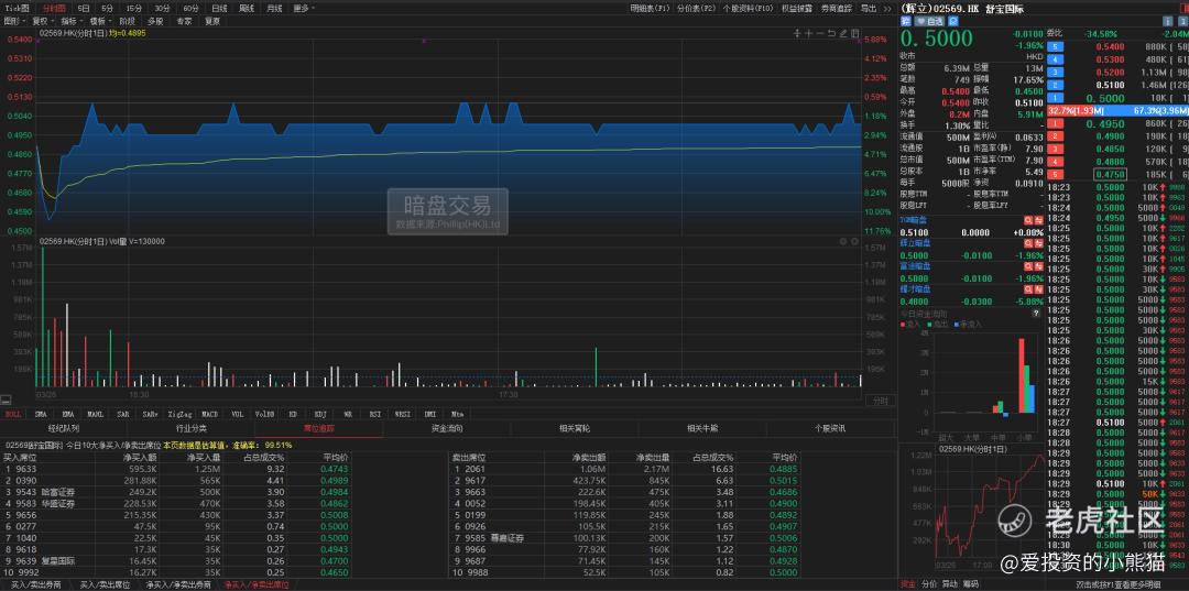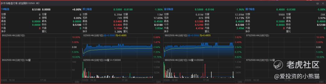 舒宝国际(02569.HK)辉立暗盘以最高价0.54港元高开,立马下探最低点0.45港元,再上冲到0.51港元后回落,在0.50港元附近震荡横盘,尾盘以0.50港元报收,跌幅1.96%,振幅17.65%。