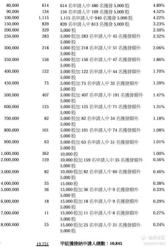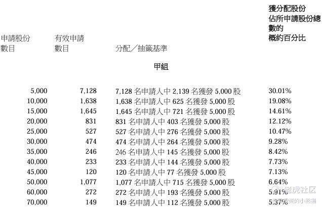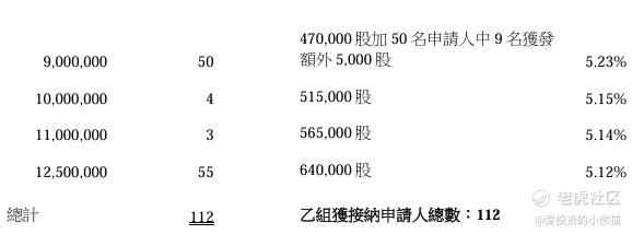 舒宝国际(02569.HK)的乙组官方披露的中签名单里有41人中签470000股,有9人中签475000股,有4人中签515000股,有3人中签565000股,有55人顶头槌认购中签640000股。乙组总共中签6250万股,货值约3188万港元。