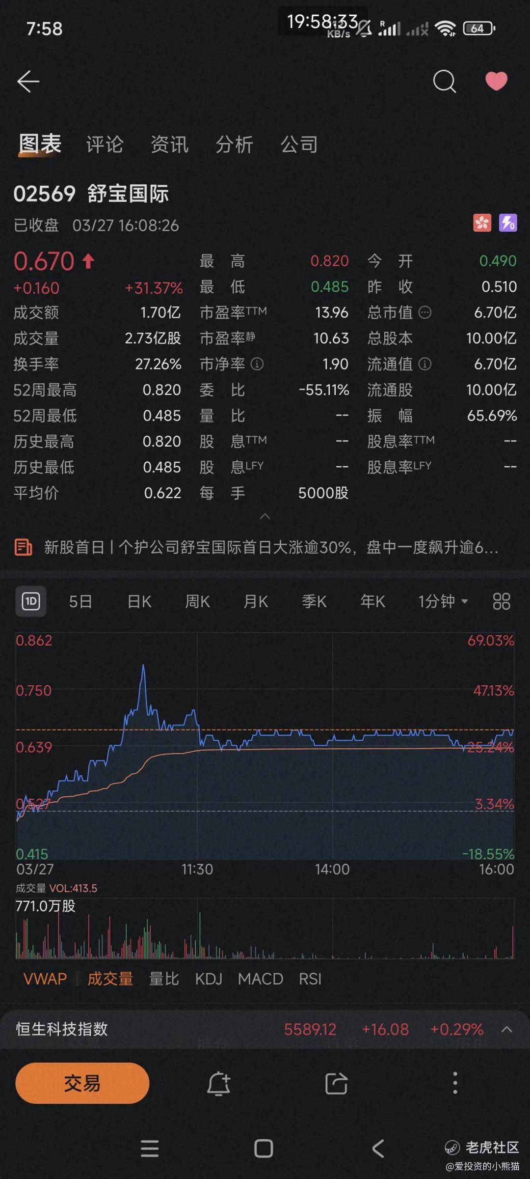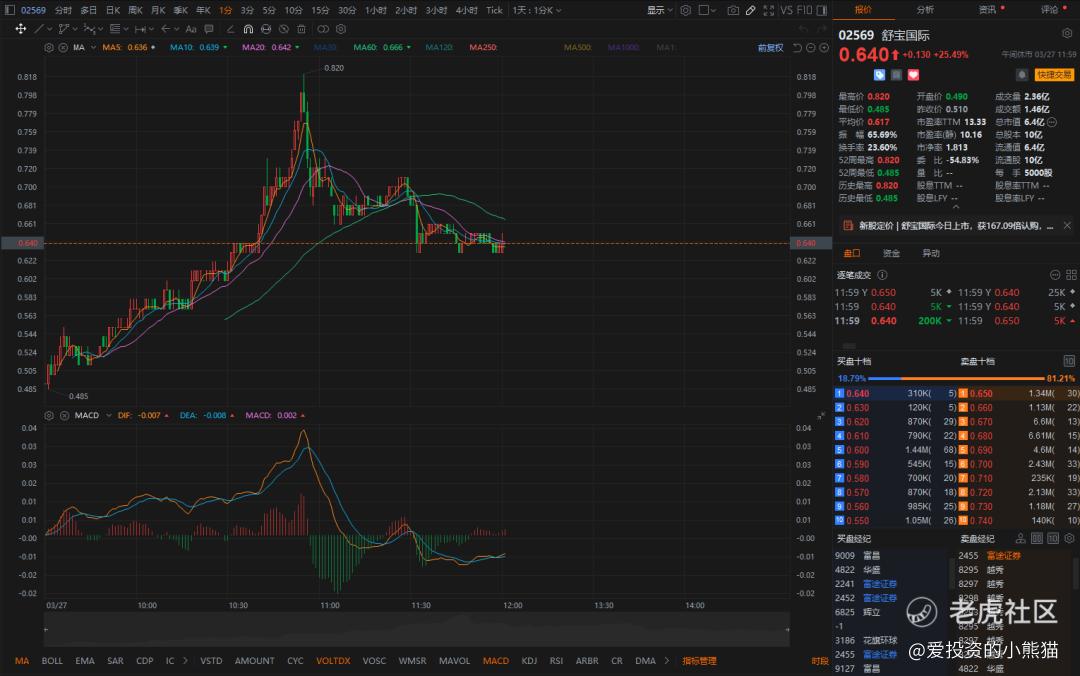 $舒宝国际(02569)$ 今日上市以0.49港元低开,下探到0.485港元后,立马震荡上行,截止中午收盘价为0.64港元,上涨25.49%,最高价0.82港元,涨幅最高冲至60%