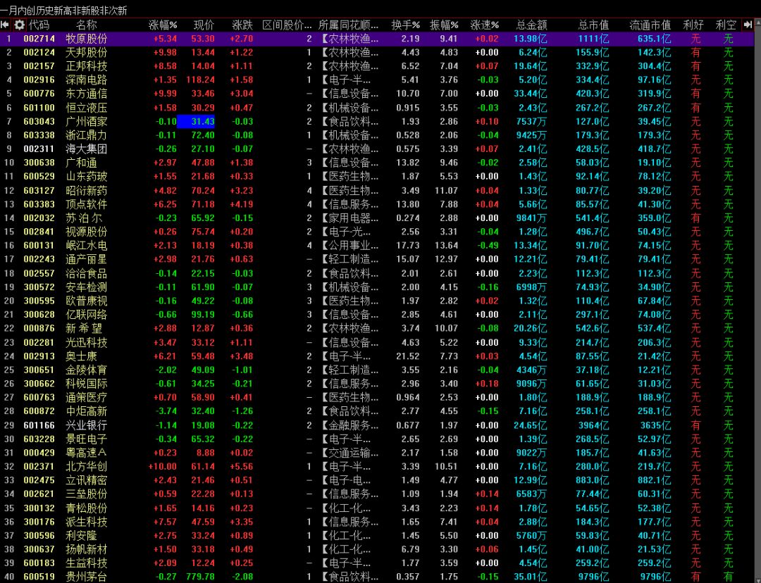 首先我们挑选出在一个月内创新高的股票,目前有40只。值得注意的是,我们排除了所有的次新股,因为次新上市就一直在涨,不存在历史前高的说法,所以像中信建投,迈瑞医疗等上市不到一年的次新股,我们都不予考虑。