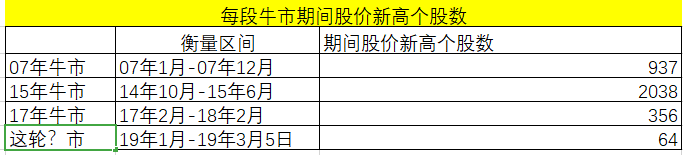 假若这一轮真是大牛市的话,我相信接下来还有不少股票有待新高,从历史数据看,64支股票创新高,无论如何都不是一轮牛市应有的水平。