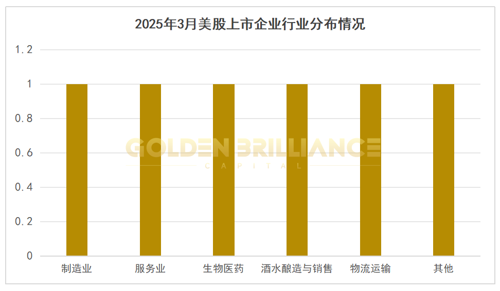 根据统计显示,2025年3月美股上市企业在不同行业中的分布情况相当均衡。制造业、服务业、生物医药、酒水酿造与销售、物流运输以及其他行业均有一家企业成功上市。这表明在该月份,各个行业的企业都有机会进入美国资本市场,没有出现某一行业特别集中的现象。这种均衡的分布可能意味着不同行业的企业都具备一定的吸引力和市场潜力,能够满足投资者的需求。同时,这也可能反映出纳斯达克对于来自不同行业企业的开放性和包容性。
