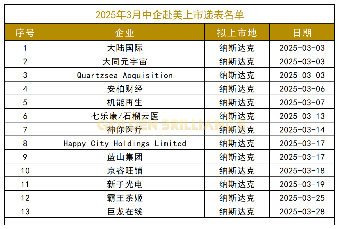2025年3月,共有13家中企递交了美股上市申请,这些企业全部计划在纳斯达克上市。这些企业包括大陆国际、大同元宇宙、Quartzsea Acquisition、安柏财经、机能再生、七乐康/石榴云医、神你医疗、Happy City Holdings Limited、蓝山集团、京睿旺铺、新子光电、霸王茶姬、巨龙在线。这些企业涵盖了物业管理服务、数字营销服务、金融印刷服务、医疗服务、医疗科技服务平台、医疗器械研发、食品餐饮、商务咨询/奢侈品表贸易、电器批发和零售、太阳能光伏薄膜制造、茶饮服务、智能集成解决服务等多种行业类型。这显示了美股市场对于不同行业企业的吸引力,并不局限于个别行业或者企业,对所有类型的企业都持开放态度。
