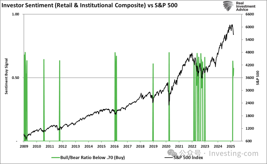 “投资者容易因情绪而判断失误,这正是我们要密切留意投资者情绪的原因。下图展示了我们的投资者情绪综合指数(涵盖散户及专业投资者)。绿色柱代表整体投资气氛极度悲观的时期。经验告诉我们,每当投资者最为悲观时,市场往往已处于或接近调整的低位。”