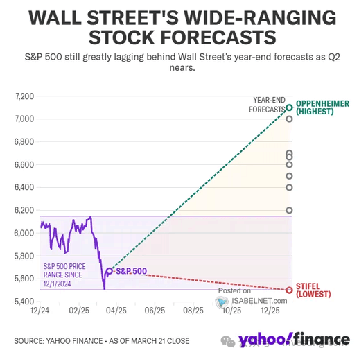 纵使近期市况波动,华尔街分析师依然看好今年后市。如图所示,他们对标普500年底目标价虽各有盘算,但普遍高于目前水平。