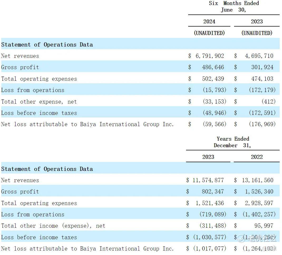 Baiya在2024年上半年营收为679万美元,运营亏损为1.6万美元,归属于Baiya的公司净亏损为6万美元。