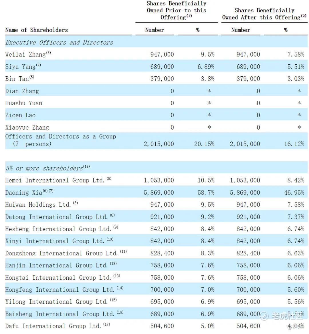 Dongsheng International持股为6.63%,Hanjin International Group、Hongtai International Group分别持股为6.06%,Hongfeng International Group持股为5.6%;