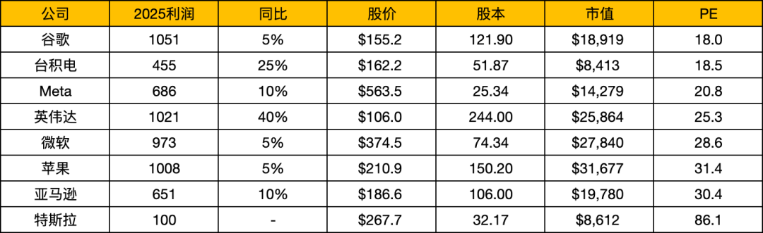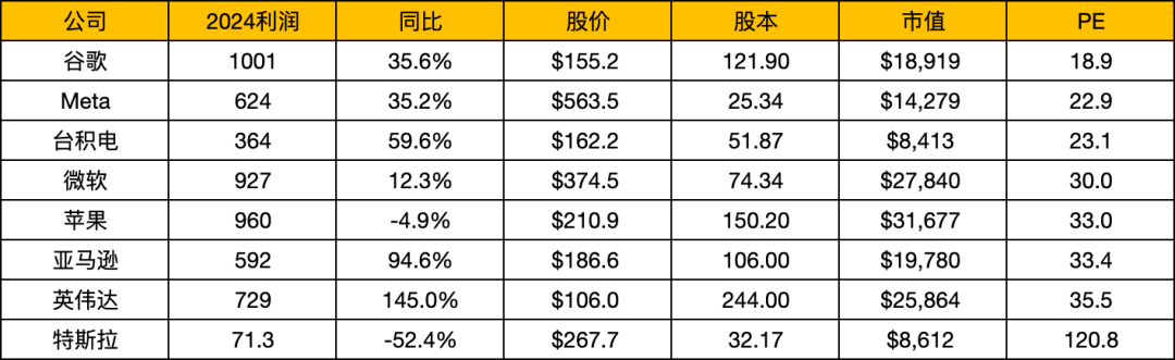 从24年的利润数据来看,谷歌,Meta,台积电大概都在20倍左右,无论是绝对估值还是相对估值都算不上贵,毕竟很多中概目前估值也差不多这个数了。