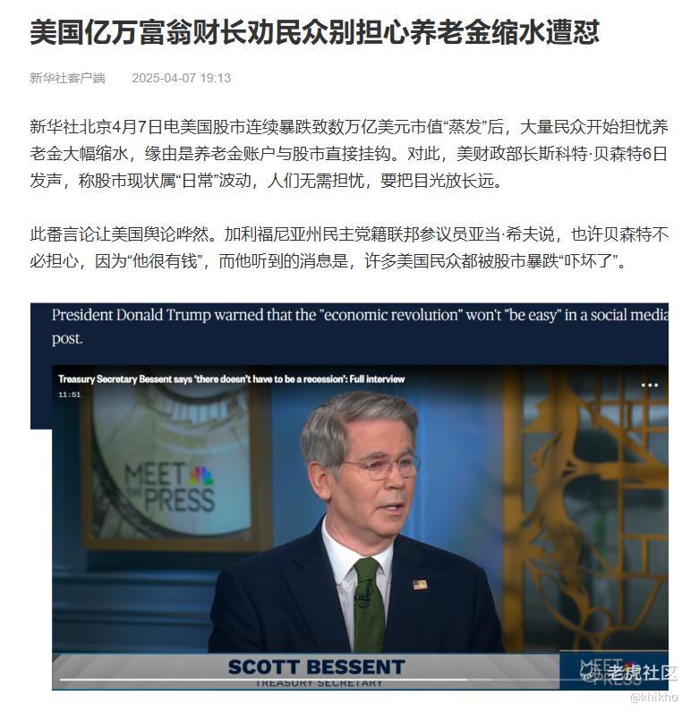 有钱人的心态就乐观很多,毕竟人家手里有的是钱,这点小风小雨的,对他们也就是挠个痒痒,美财政部长斯科特·贝森特4月6日还公开发声,称股市现状属“日常”波动,人们无需担忧,要把目光放长远。很多爆仓的朋友们,现在都过不起了,怎么看长远,拿什么看长远啊。[喷血]