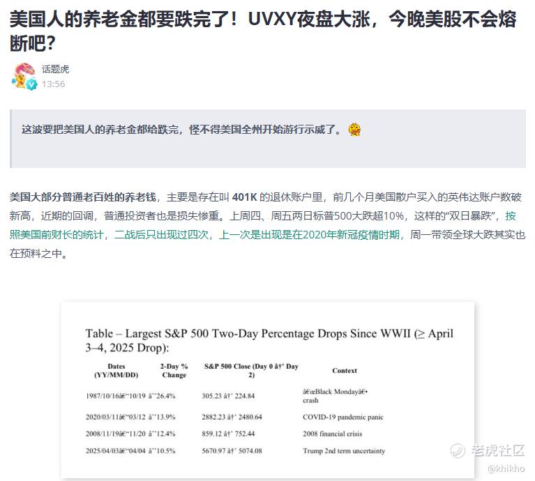 话题虎老师还特意发了帖子给大家讨论,美国人的养老金都要跌完了!UVXY夜盘大涨,今晚美股不会熔断吧?