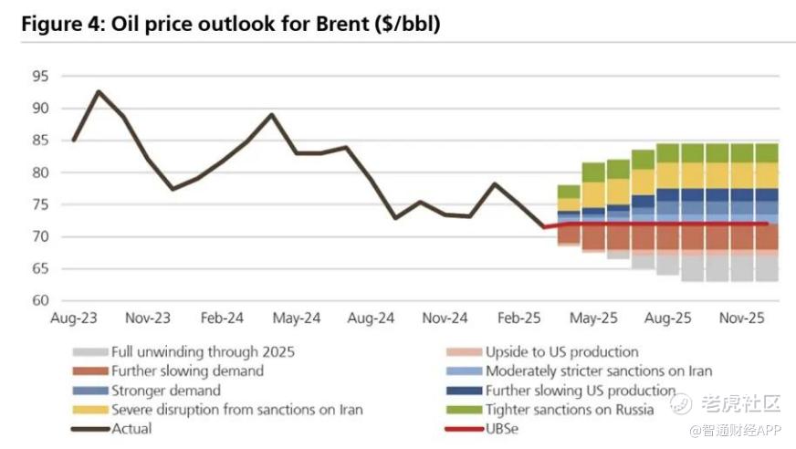 瑞银在关税消息公布前,曾将 2025 年第二季度布伦特原油价格预期下调至每桶 70 美元,2025 年下半年下调至每桶 72 美元。上周之后,瑞银预期价格下行的可能性显著增加:(1)OPEC + 推动更快增产;(2)需求可能大幅下降。瑞银初步估计,美国关税将使全球经济增长放缓 50 个基点(不包括信心效应)或 100 个基点(包括信心效应)。后者预计会使油价每桶下行 5 美元。