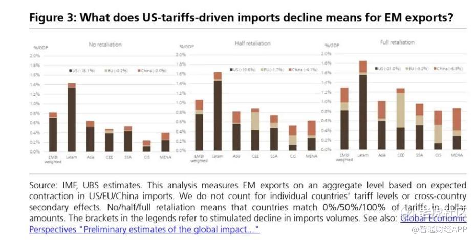 图 3基于瑞银对美国、欧盟和中国进口收缩的模型估计,展示不同报复情景下新兴市场出口受冲击情况,拉美地区在各情景下受影响居前,中东欧和亚洲出口受冲击程度与关税报复程度相关。