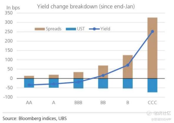 图 1纵坐标为基点,横坐标为评级(AA、A、BBB、BB、B、CCC),展示自 1 月底以来收益率变化分解(利差、美国国债收益率)