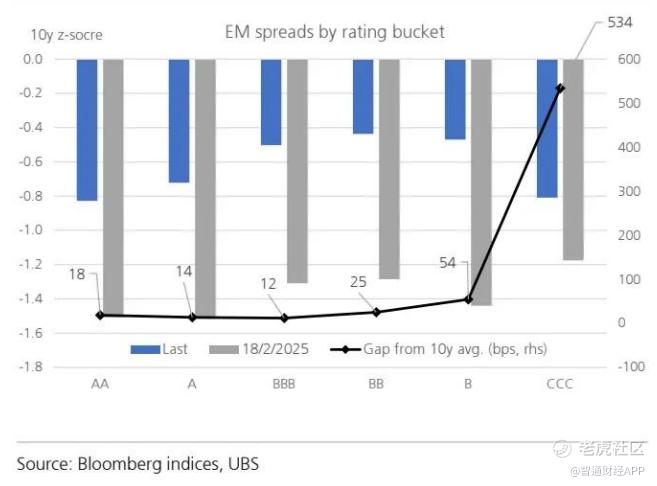 据瑞银估算,新兴市场基金对 AA/A 评级资产的配置处于历史低位,原因是对单一 B 和 CCC 评级资产的配置处于历史高位。这种情况使得单一 B 和 CCC 评级资产风险暴露,因为它们传统上因本地投资者基础有限,更严重依赖国际资金。BB 评级资产中也有许多处于配置区间的高位。但总体而言,我们对此不太担忧,因为在摩洛哥、塞尔维亚和阿曼等地,宏观基本面不断改善,支撑着利差。