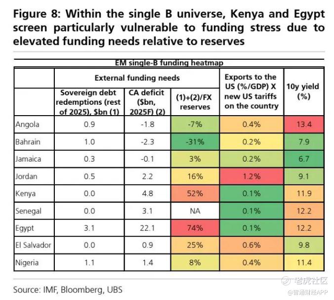 图 8:在单一 B 评级债券范围内,肯尼亚和埃及由于相对储备而言的高融资需求,在资金压力方面表现得尤为脆弱