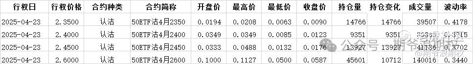(1)50ETF期权:今收2.628,反弹2.22%,从K线形态上看,有那么点“阳包阴”的意思。最大持仓范围从昨天的2500-2700,变成2600-2750,支撑位上移。期权盘路持仓成交较昨天有所下降,变动较多的具体如下图,增仓主要集中在4月的2350-2600认沽,合计4.8W张。
