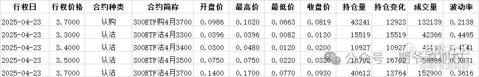 (2)上证300ETF期权:今收3.730,反弹0.95%,K线形态则差强人意。最大持仓范围从昨天的3600-4000,变成3700-4000,支撑位上移。期权盘路持仓成交较昨天有所下降,期权盘路持仓变动较多的具体如下图,增仓主要集中在4月的3300-3700认沽,合计6.9W张。