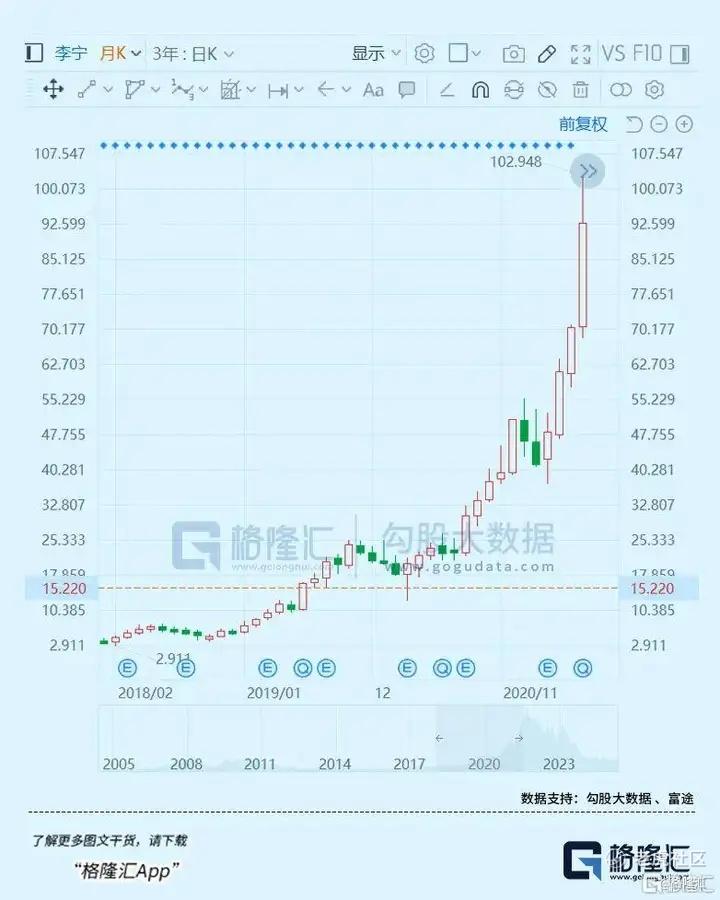李宁的股价在此之后也在三年时间内暴涨近20倍,从2018年的5港元/股,上涨到2021年最高点的102港元/股。