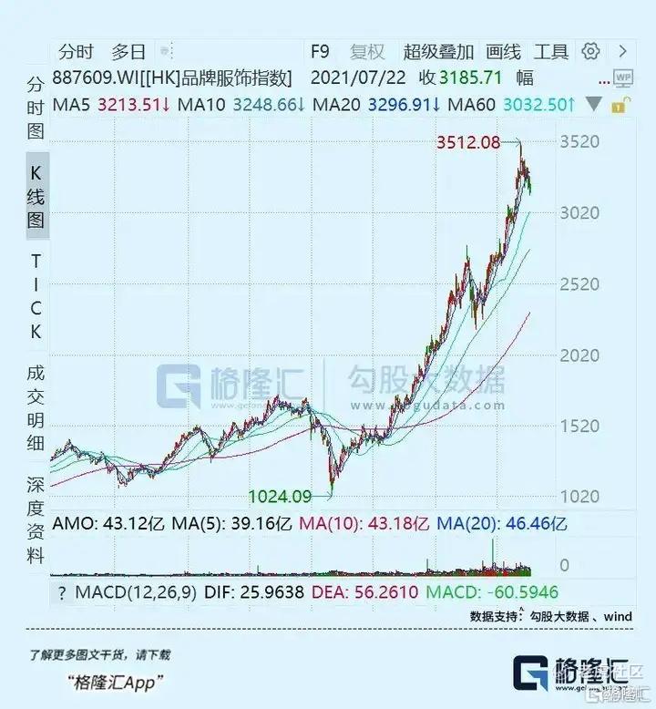 2018年至2021年之间,WIND港股品牌服装指数从1161.75点涨至最高的3457.52点,涨幅近300%。