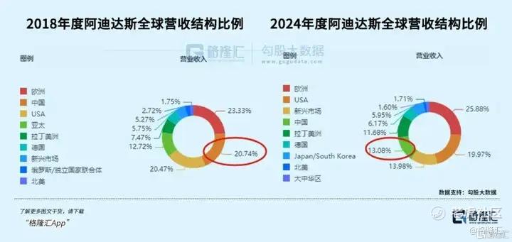 以阿迪为例,2018年,阿迪达斯中国区营收45.46亿元,总营收占比达到20.74%,为第二大单一市场。但当时间来到2024年,阿迪达斯中国区的营收反而降至30.97亿元,占比也下滑至13.08%,在几大市场中排名第四。