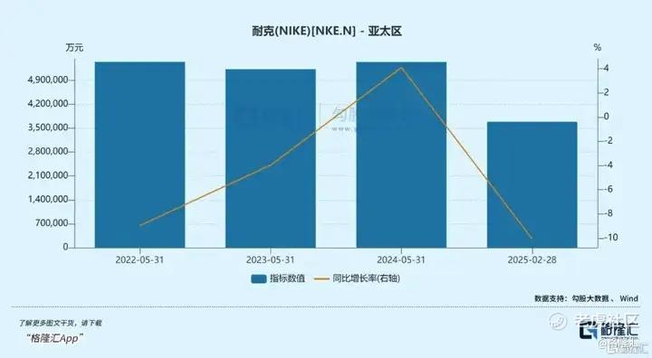 耐克也面临同样的困境,耐克最新财报显示,2025财年第三季度,耐克亚太地区收入同比下滑10.07%,大中华地区批发渠道收入下滑达到16.8%。