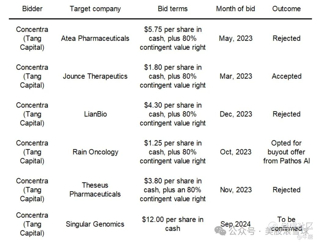 Concentra Biosciences的背后是华人财团Tang Capital Partners(创始人为Kevin Tang,中文名为唐庆年),以收购市值低于账上现金的Biotech公司闻名。 Concentra之前就有过棒打鸳鸯的先例: