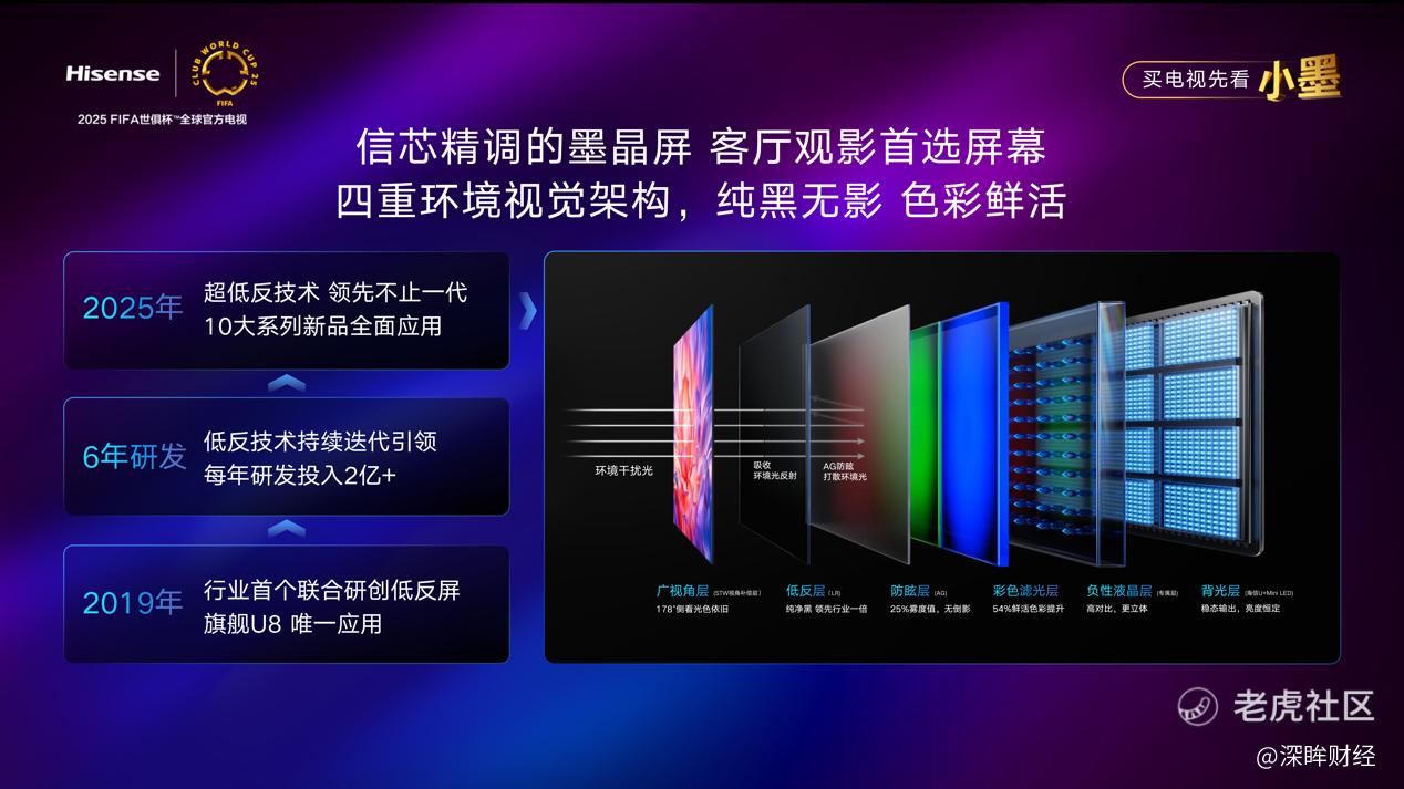 在屏幕创新上,海信小墨E5Q Pro墨晶屏解决了传统电视受环境光干扰的痛点。普通电视屏幕容易受眩光、倒影影响,雾面屏则存在透光率低、视角狭窄等缺陷。墨晶屏通过四重技术架构实现全新突破:低反层与防眩层组合将反射率压至2.6%,纯净黑度较行业均值提升100%;STW视角补偿层确保178°广视角下色彩一致性。负性液晶技术令透光率与响应速度同步提升,色彩表现增强54%。这一组合使电视在强光环境与多角度观看场景中均能呈现定画质。