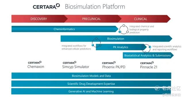 Certara业务涵盖药物研发的全生命周期,比如Simcyp Discovery Simulator是业内最先进的生理药代动力学(PBPK)平台,包含用于小鼠、大鼠、犬、猴和人的PBPK模型,可用于首次人体试验(FIH)剂量、特殊人群PK、设定在未受测人群中使用的剂量等方面的预测,横跨药物筛选和临床前阶段;再如其Certara.AI平台提供临床试验设计优化、真实世界证据(RWE)分析等服务。