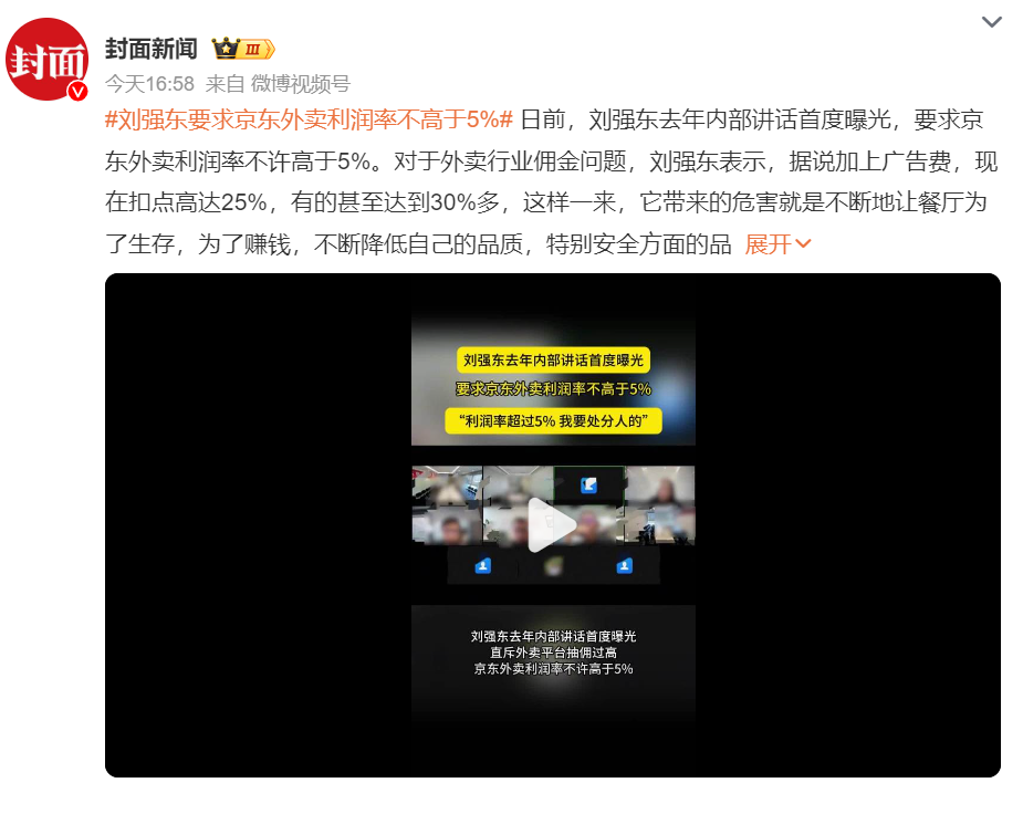 刘强东内部讲话曝光,要求京东外卖利润率不许超过5%