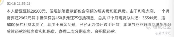 另一名用户表示,他在豆豆钱借款29500元,发现该笔借款都包含高额的服务费和担保费。每个月需要还2962元,其中担保费就450多元,12个月总共需要还35544元。盐铁财经根据这名用户反映的数据计算,其承担的年化综合借贷成本高达35.9%。